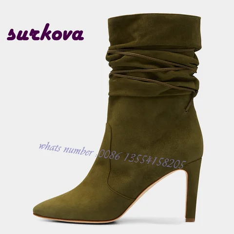 Lace Up Suede Pleated Boots Casual Pointy Toe Cross Strappy Mid Calf Boots Winter Stiletto Heels for Women Slip on Elegant Shoes