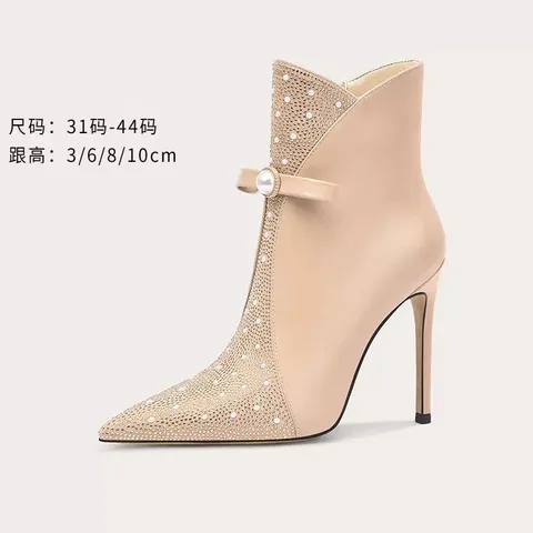Side Air Crystal Ankle Boots Pointed Toe Leather Stiletto Heels Back Zip Solid Nude Luxury 2022 New Designer Party Wedding Shoes