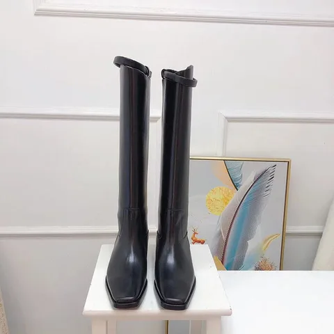 High Quality Autumn/Winter 2022 Chelsea Loop Women's Boot With Square Toe Leather Chunky Heel Flat High Boot Knight Boot