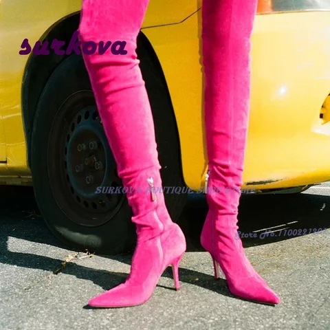 Pink Stretch Velvet Over The Knee Boots Pointy Toe Side Zipper Stiletto Heels Women's Long Boots Winter Solid Elegant Shoes Sexy