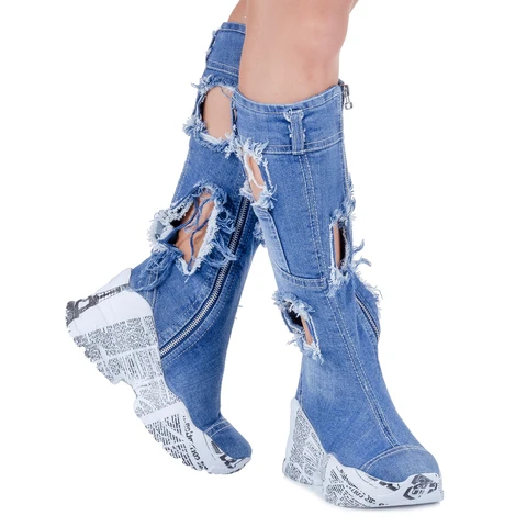 Denim Boot Above Knee Boots Handcrafted Sexy Design Blue Pattern Embroidered Denim Women's boots birthday present