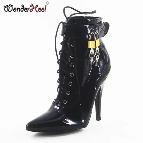 Wonderheel Extreme High Heel 12cm Stilleto Heel Sexy Ankle Boots Black Patent Pointed Toe Boots with Two Lockable Padlocks