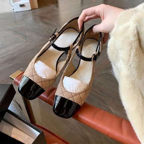 Color Matching Square Toe Shallow Pumps Stitching Kink Upper Commuter Chunk Heel Shoes Women Buckle High Heels Sandalias