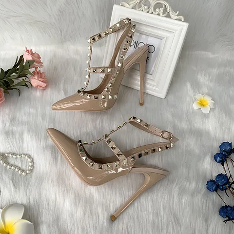 Hot sale brand designer TOMONYE dark nude patent two stud straps 12cm women lady girl high heel slingback party dress sheos