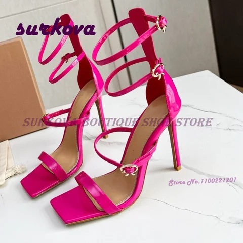 Patent Leather Stiletto Sandals Gold Metal Buckle Magenta Square Toe Solid Summer Party Sandals Women 2023 New Sexy Runway Shoes