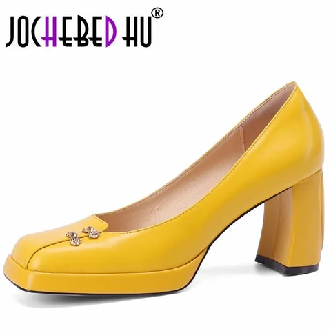 【JOCHEBED HU】Size 33-40 Square Toe Genuine Leather High Heel Shoes Thick-soled Waterproof Fashion Club Party Women Heels Shoes