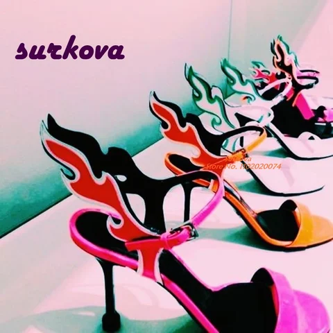 Mixed Color Flame Buckle Sandals Open Toe High Heels Slingback Women's Sandals One Strap Patent Leather Runway Party Shoes Sexy