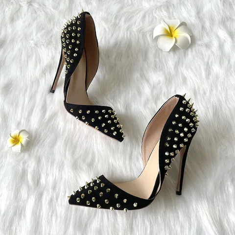 TOMONYE black suede gold rivets stud open in the middle plus big size46 extra small size33 women lady 120mm high heel shoes