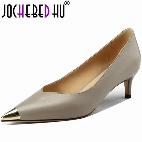 【JOCHEBED HU】Luxury Genuine Leather Pointed Toe Thin High Heels Spring Shoes Metal Decorations Wedding Grace Slip on Brand Pumps