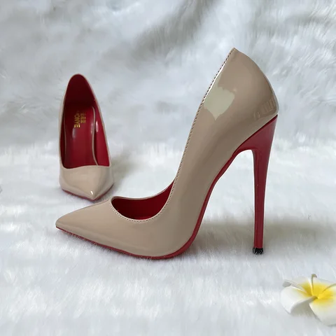 Free Shipping Nude Patent Pointed Toe Woman Lady Sexy 12cm Red High Heel Pump Evening Dress Shoes On Sale Super Big Size 45 46