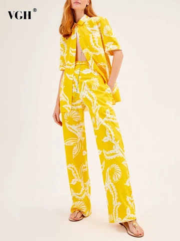 VGH Colorblock Print Sets Female Lapel Half Sleeve Single Breasted Top Wide Leg Long Pants Loose Two Piece Set For Women Spring