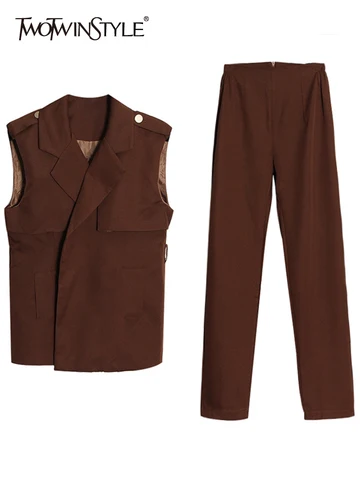 TWOTWINSTYLE Elegant Solid Two Piece Set Women Notched Sleeveless Slim Top High Waist Full Length Pant Women's Suit 2022 Stylish