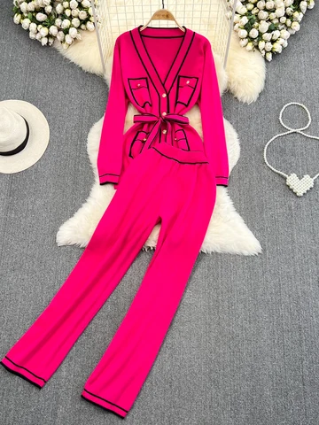HIGH STREET Newest 2023 Designer Runway Suit Set Women's Contrast Long Sleeve V-neck Single Breasted Knitting Cardigan Pants Set