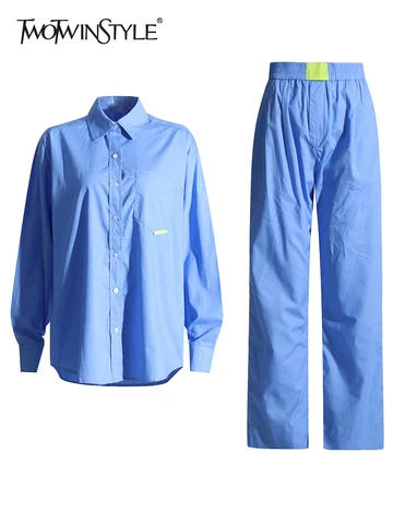 TWOTWINSTYLE Solid Two Piece Sets For Women Lapel Long Sleeve Tops High Waist Wide Leg Pants Loose Set Female Fashion Clothing