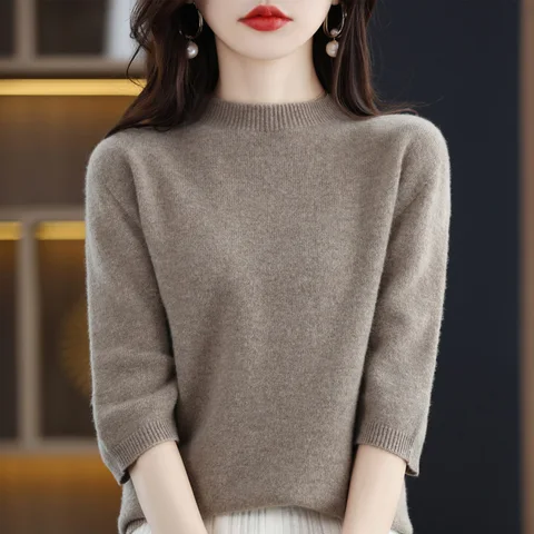 100% pure wool women's sweater short-sleeved knitted O-neck pullover women's half-sleeved Korean loose women's fashion top