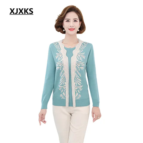 XJXKS 2022 Autumn Winter Latest Pullover Women's Fake Two-piece Loose Large Size Diamond Wool Knitted Sueters De Mujer