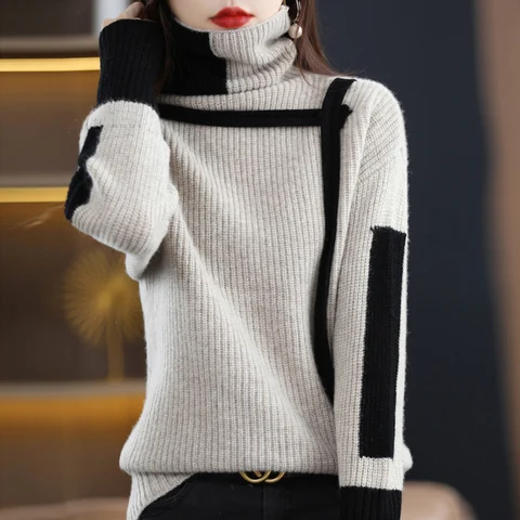 Turtleneck Sweater Women Colorblock 100% Wool Sweater Loose Pullover European Station Knitted Long-sleeved Bottoming Shirt New