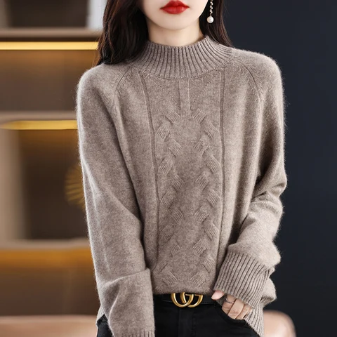 100% pure wool sweater women's 2022 autumn and winter new half turtleneck pullover solid color knitted top loose sweater women