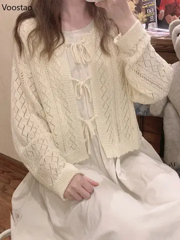 Spring Autumn Sweet Lolita Knitted Cardigan Women Retro Chic Hollowed Out Lace Up Sweater Coat Girls Harajuku Thin Knitwear Tops