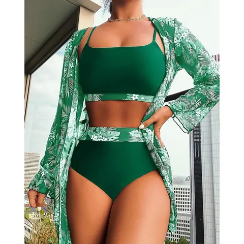 Cikini High Waisted Swimsuit Women Sexy Bandeau Swimwear 3 Pieces Cover-ups Long Sleeve Mesh Bathing Suit Print Beachwear New