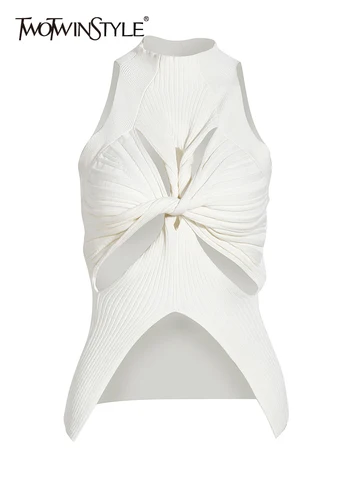 TWOTWINSTYLE Sexy Cut Out Vest For Women Round Collar Sleeveless Solid Minimalist Knitting Vests Female Summer Clothes Style New