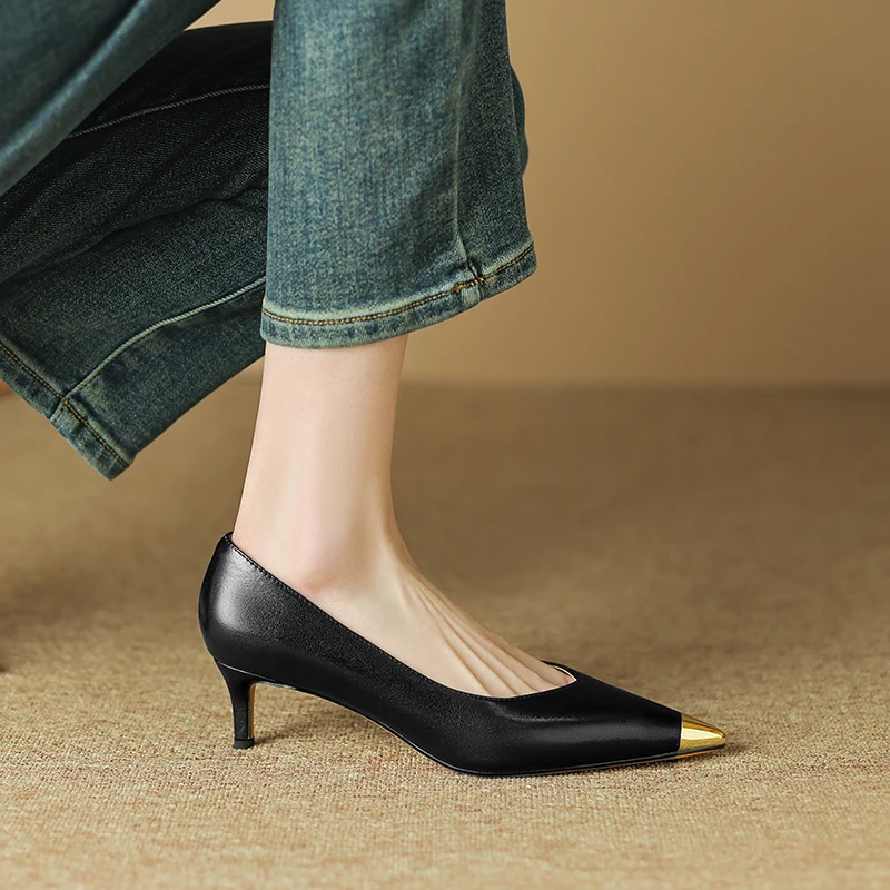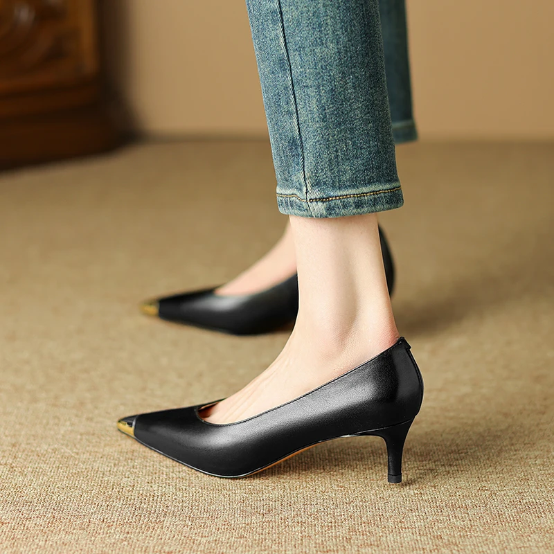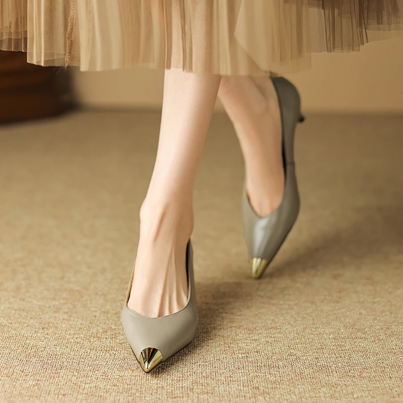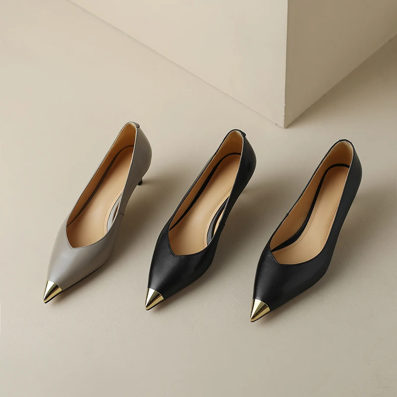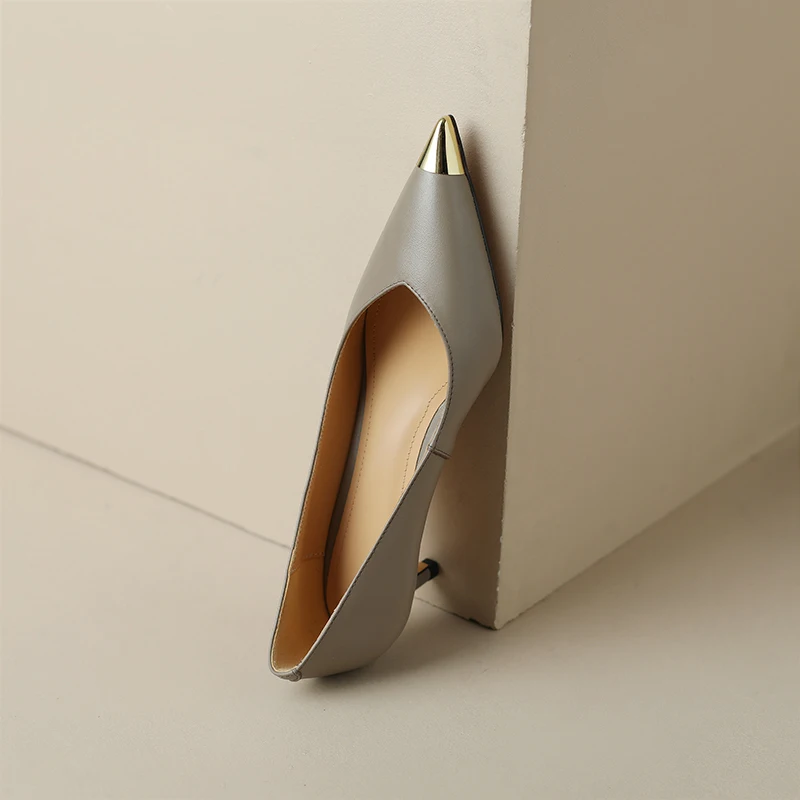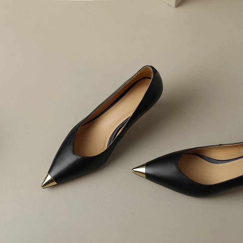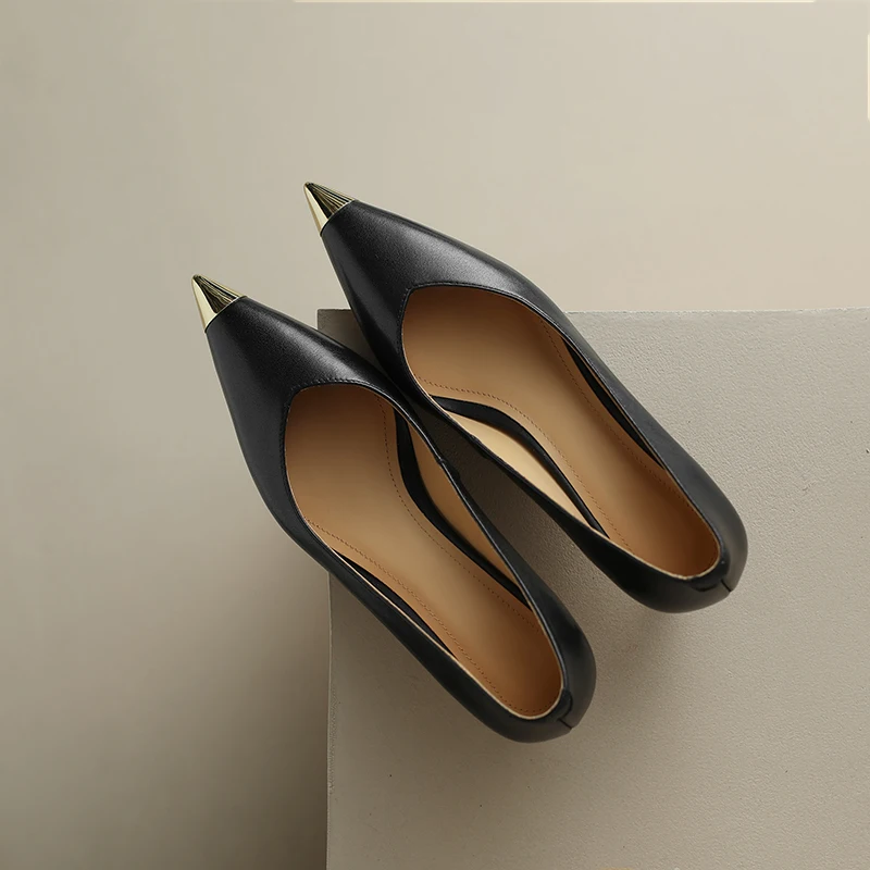 【JOCHEBED HU】Luxury Genuine Leather Pointed Toe Thin High Heels Spring Shoes Metal Decorations Wedding Grace Slip on Brand Pumps