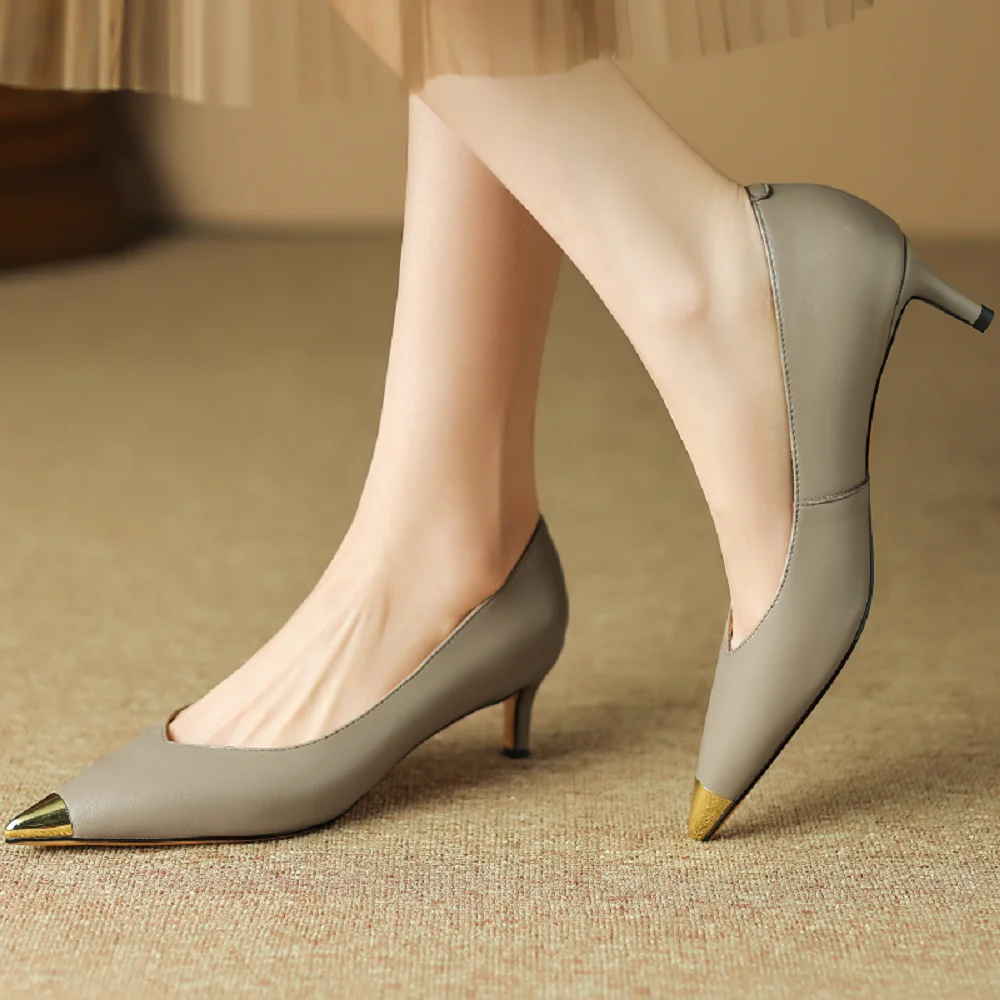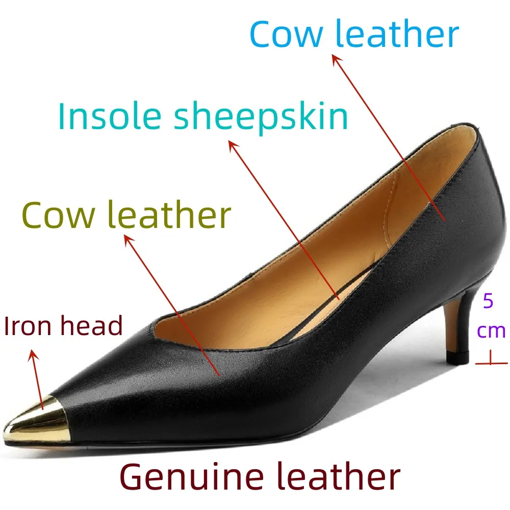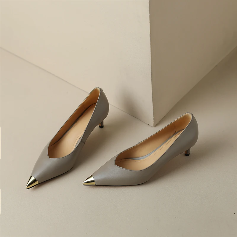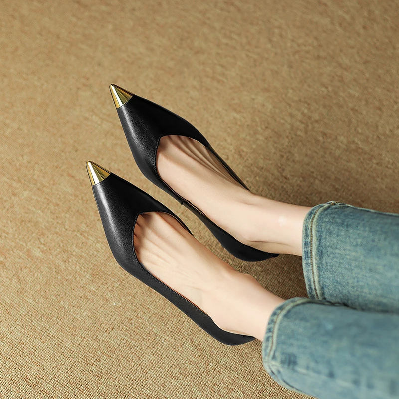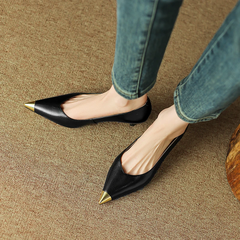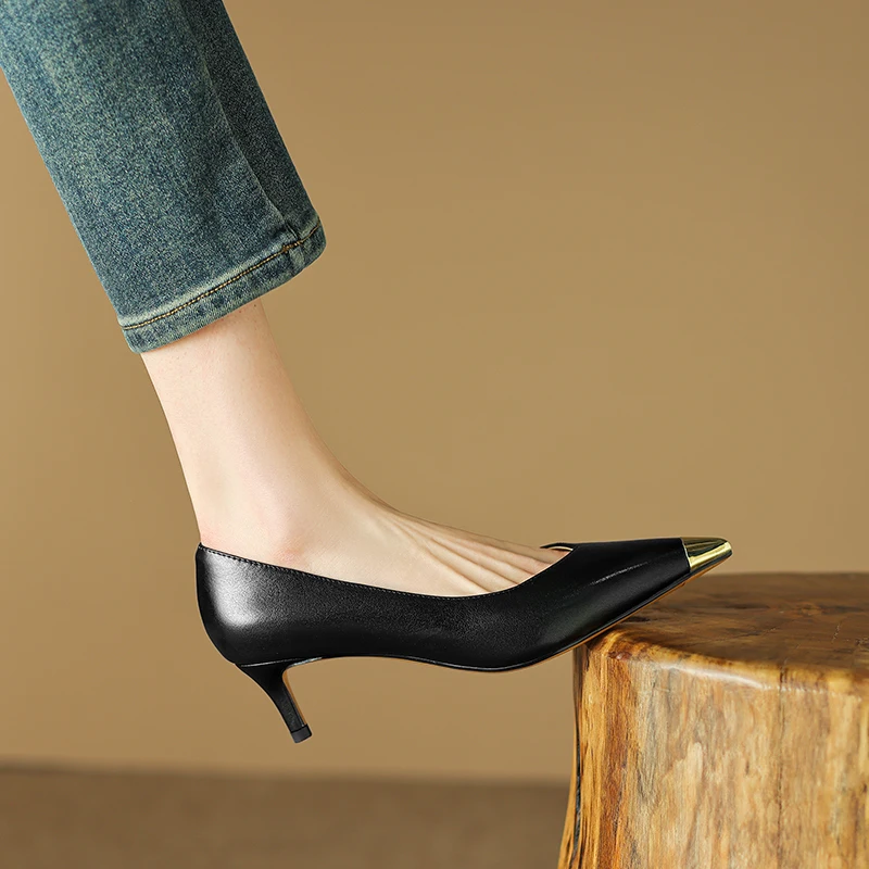 【JOCHEBED HU】Luxury Genuine Leather Pointed Toe Thin High Heels Spring Shoes Metal Decorations Wedding Grace Slip on Brand Pumps