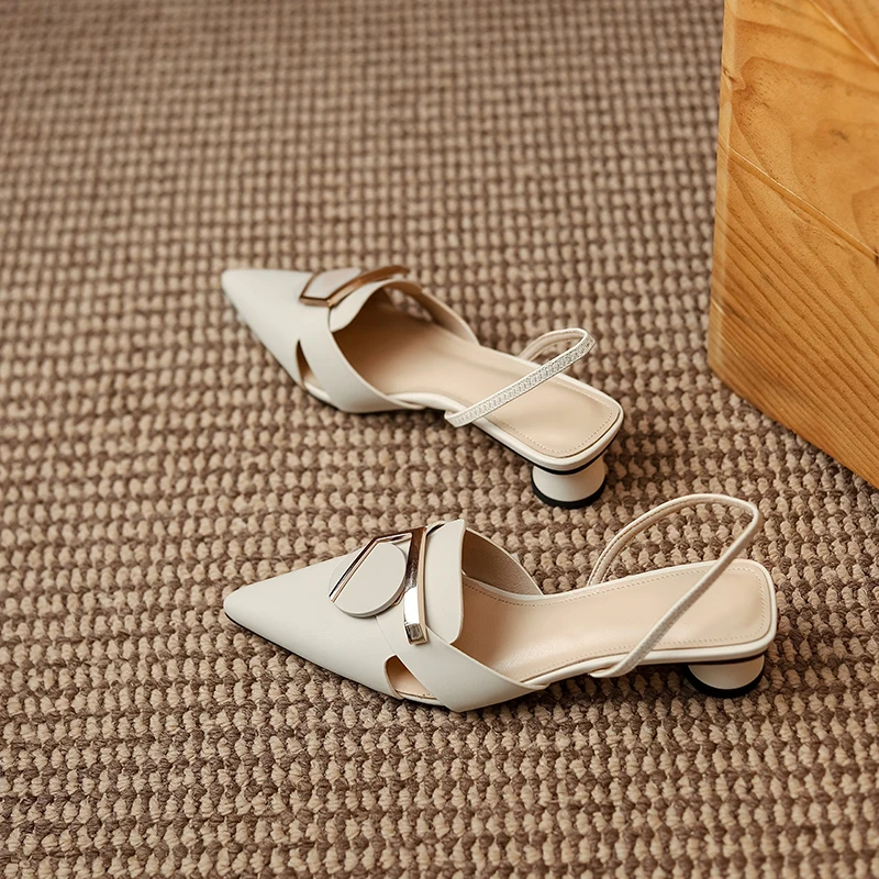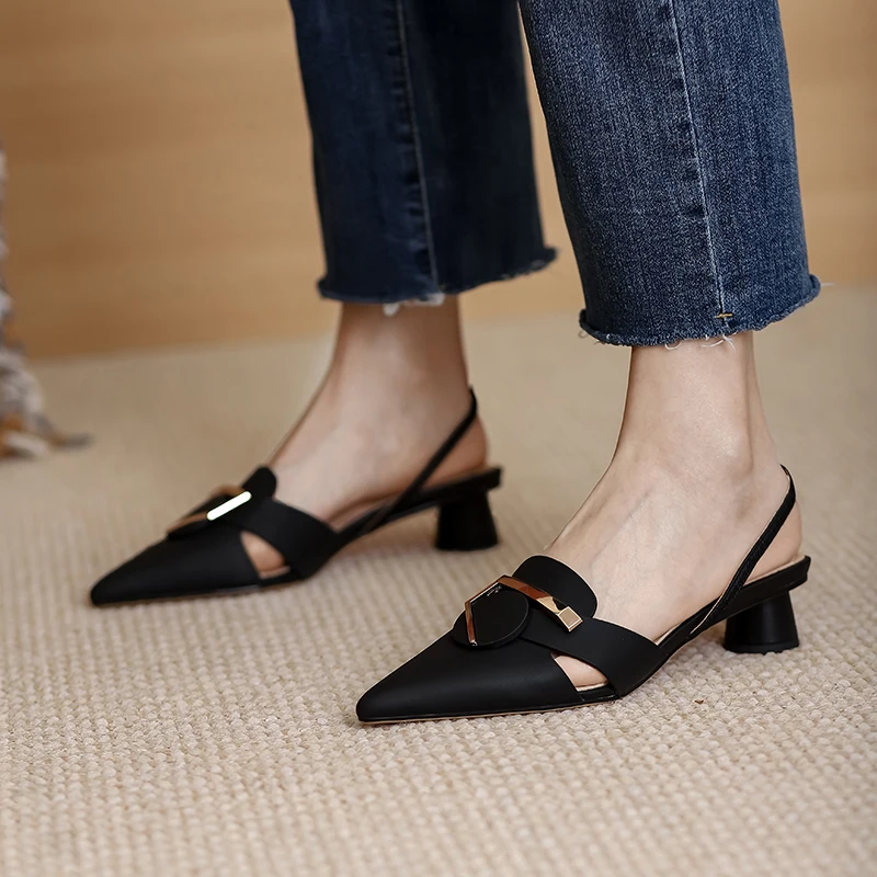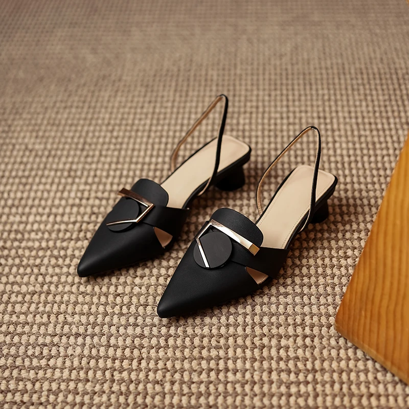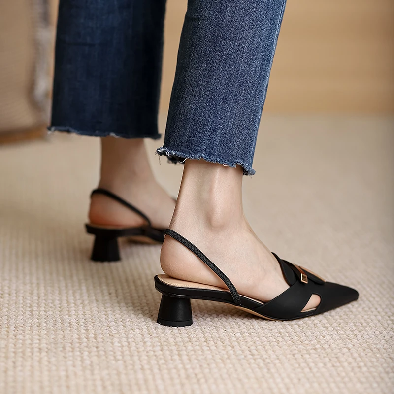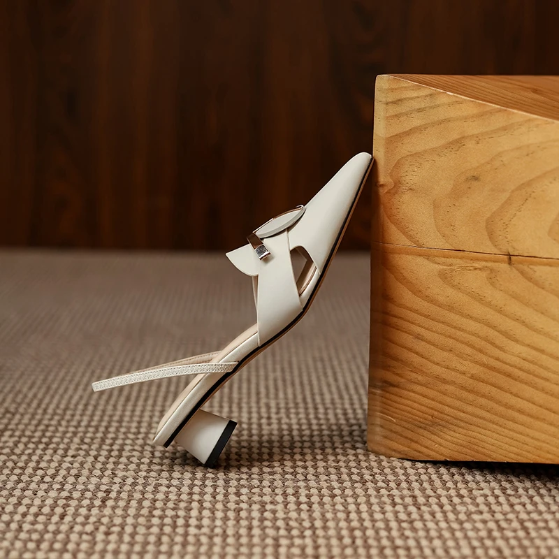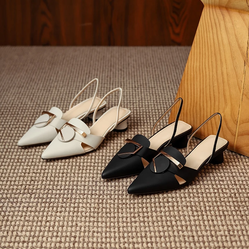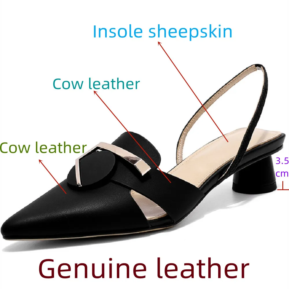 【JOCHEBED HU】Women's Genuine leather high quality base shoes point toe slipper and middle heel sandal Shoes 33-43