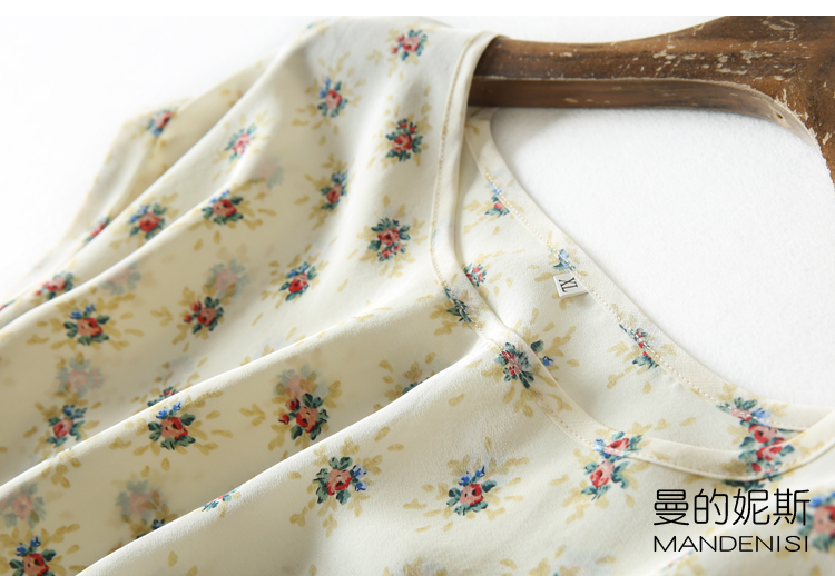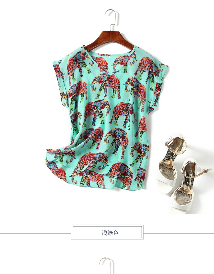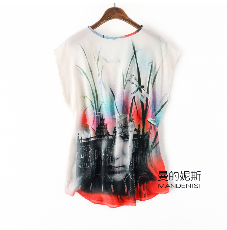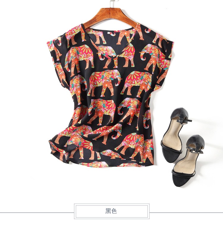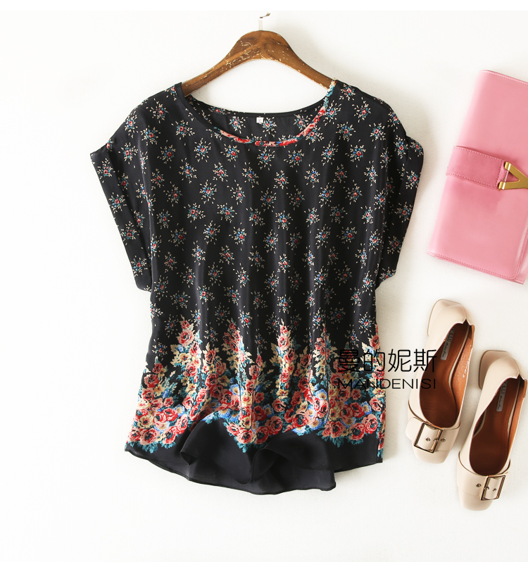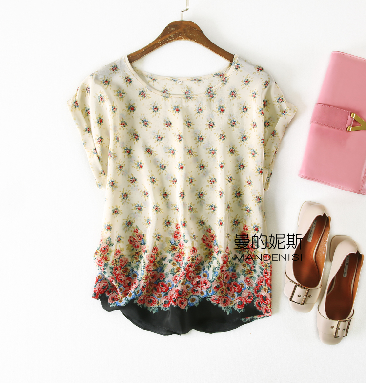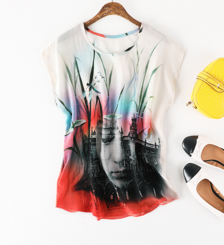 100% natural silk short-sleeved shirt female silk wild bottoming shirt personalized printing large size blouse