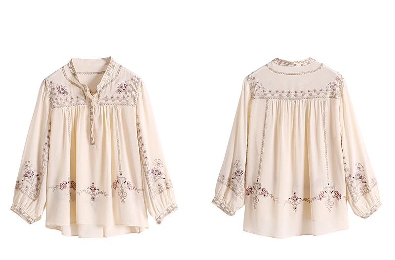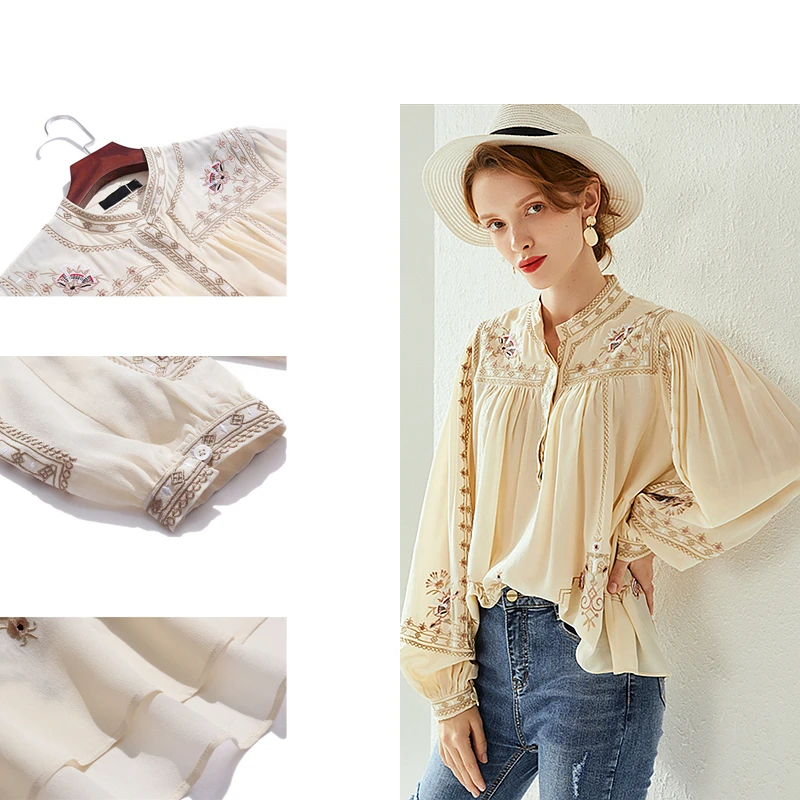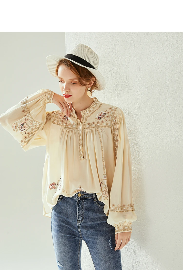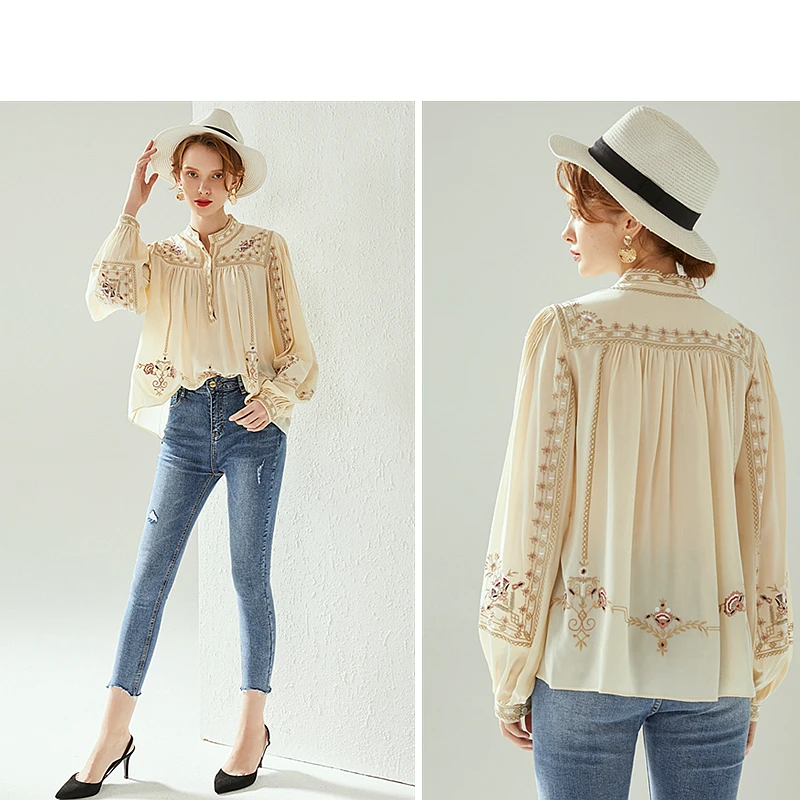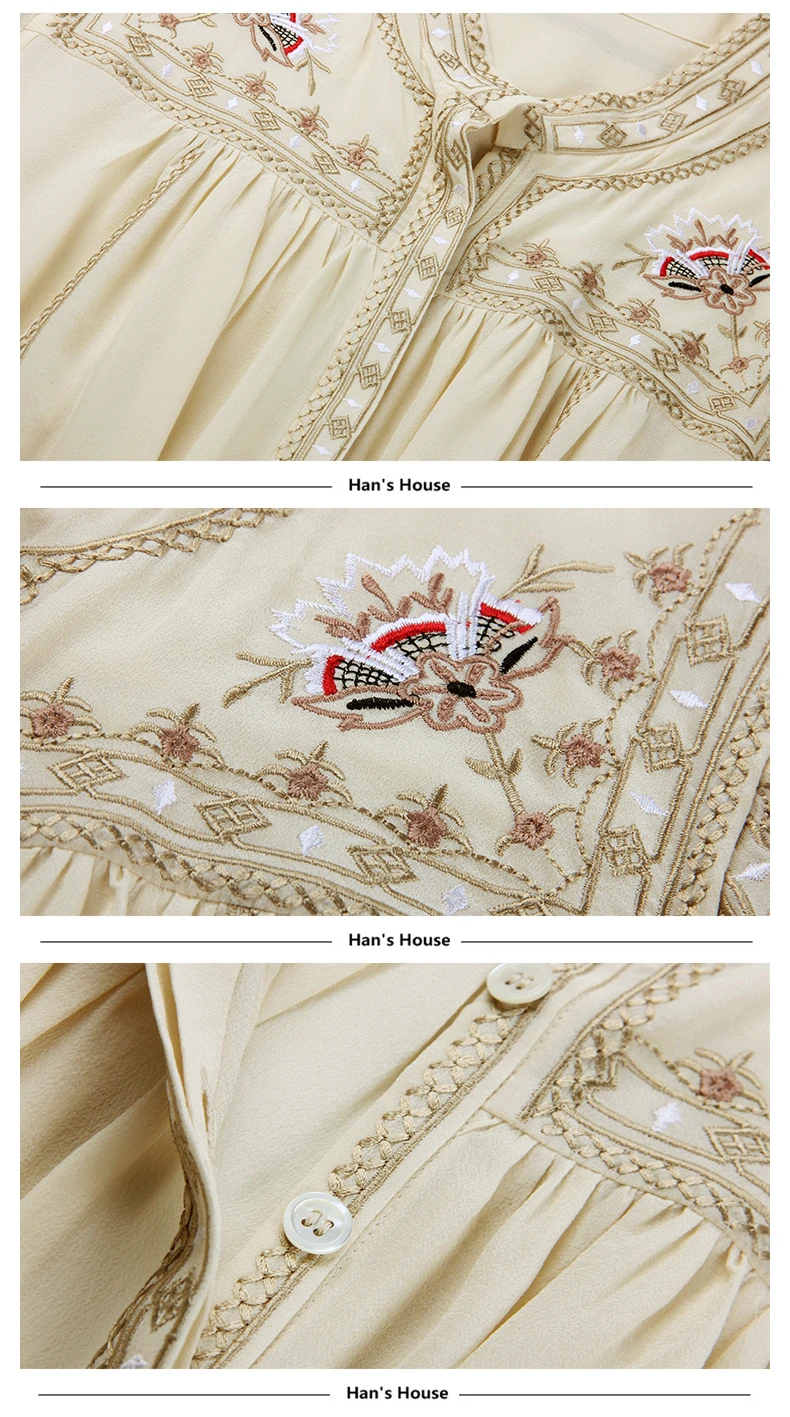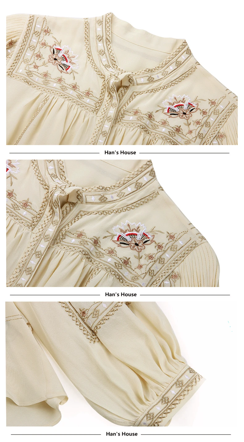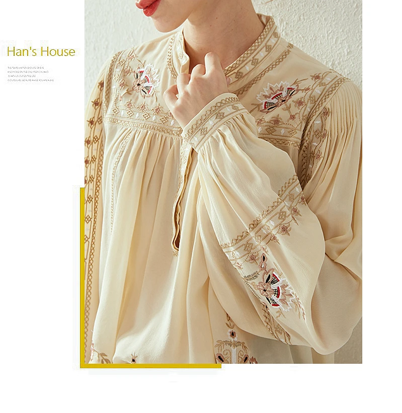 100% Silk Blouse Women Casual Style Vintage Embroidered Stand Neck Three Quarter Sleeve Top Elegant Shirt New Fashion