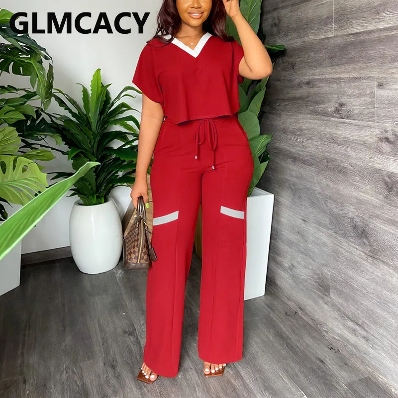 2 Pieces Pants Sets Women Draw String Wide Leg Pants & Short Sleeve T-shirt
