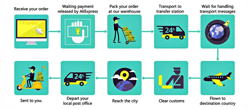 Receive you order – Waiting payment released by JustKoala.com – Pack you order at our warehouse – Transport to transfer station – Wait for handling transport messages – Sent to you – Depart your local post office – Reach the city – Clear customs – Flown to destination country
