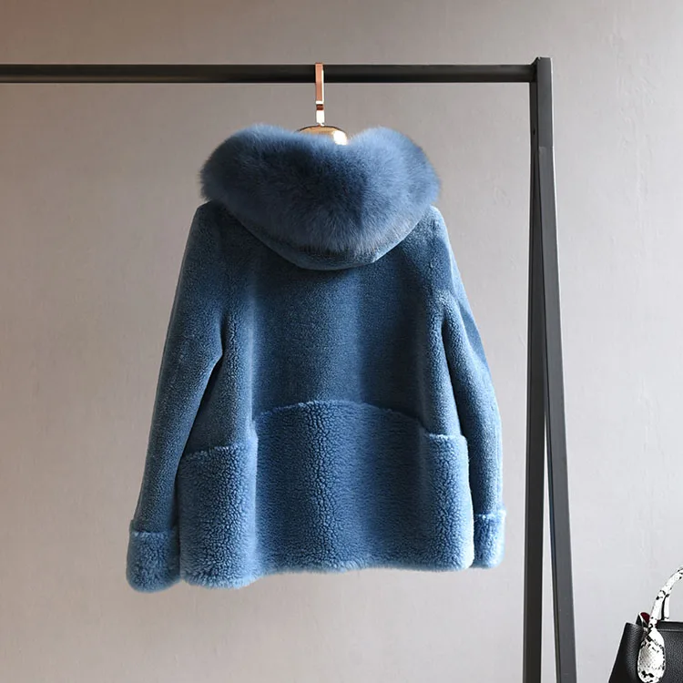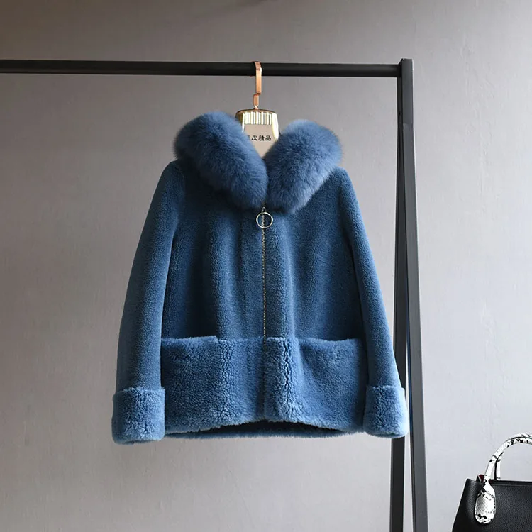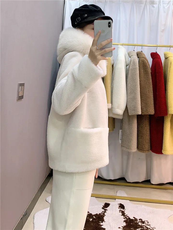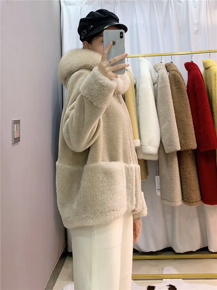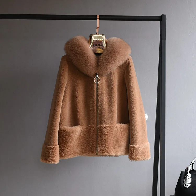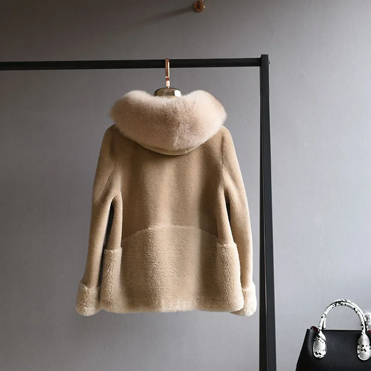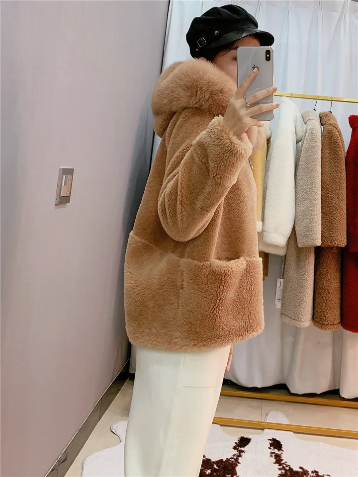 2022 Brand Real Fur Coat Winter Jacket Women Natural Fox Fur Collar Hood 100% Wool Content Woven Outerwear Teddy