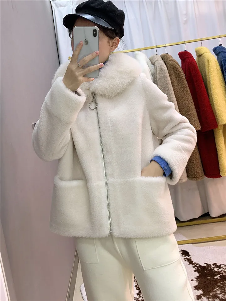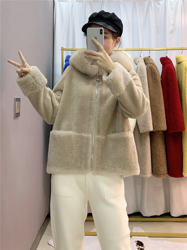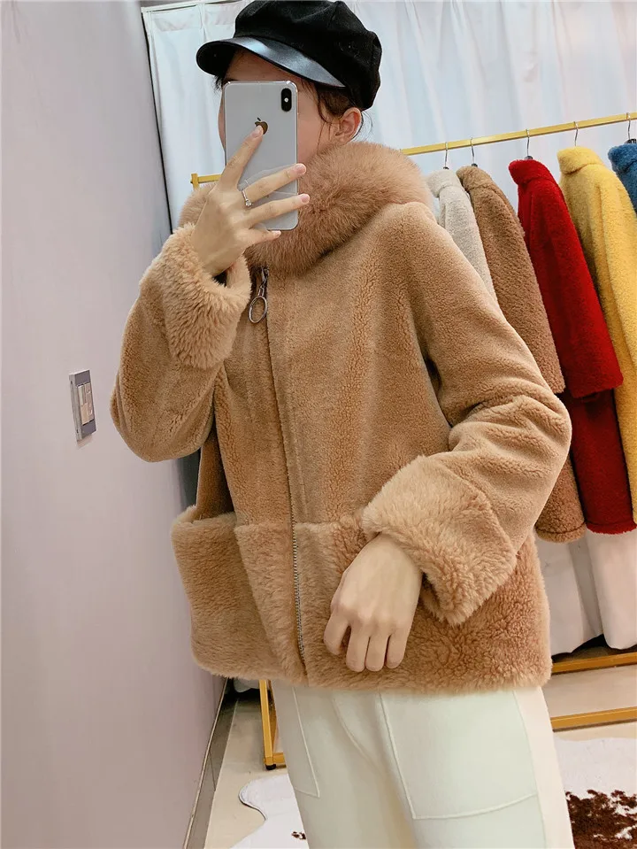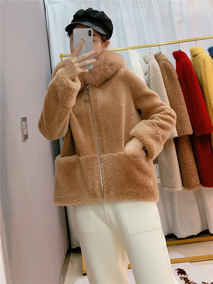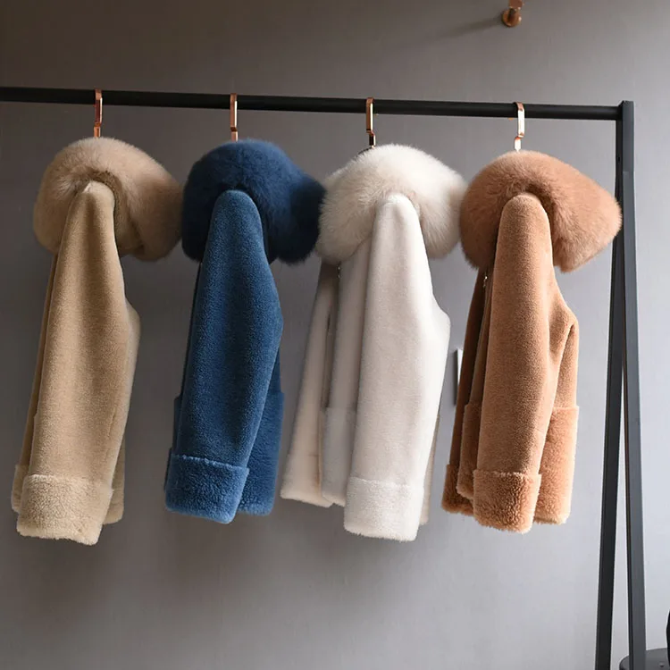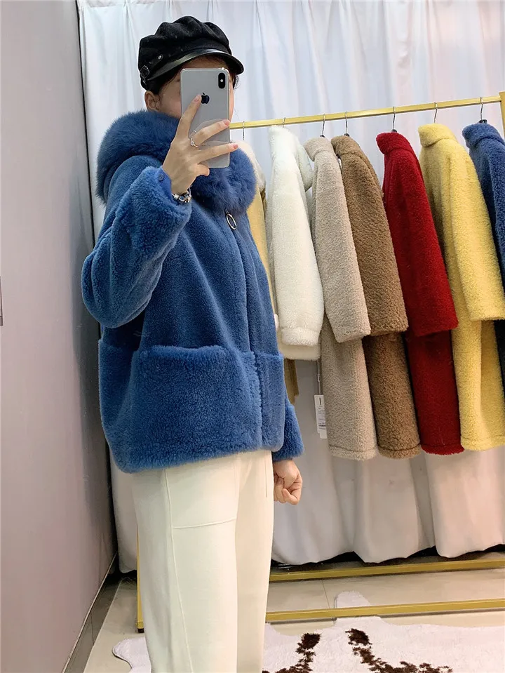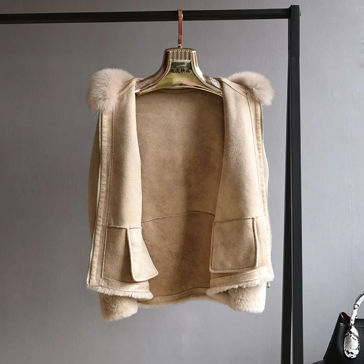 2022 Brand Real Fur Coat Winter Jacket Women Natural Fox Fur Collar Hood 100% Wool Content Woven Outerwear Teddy