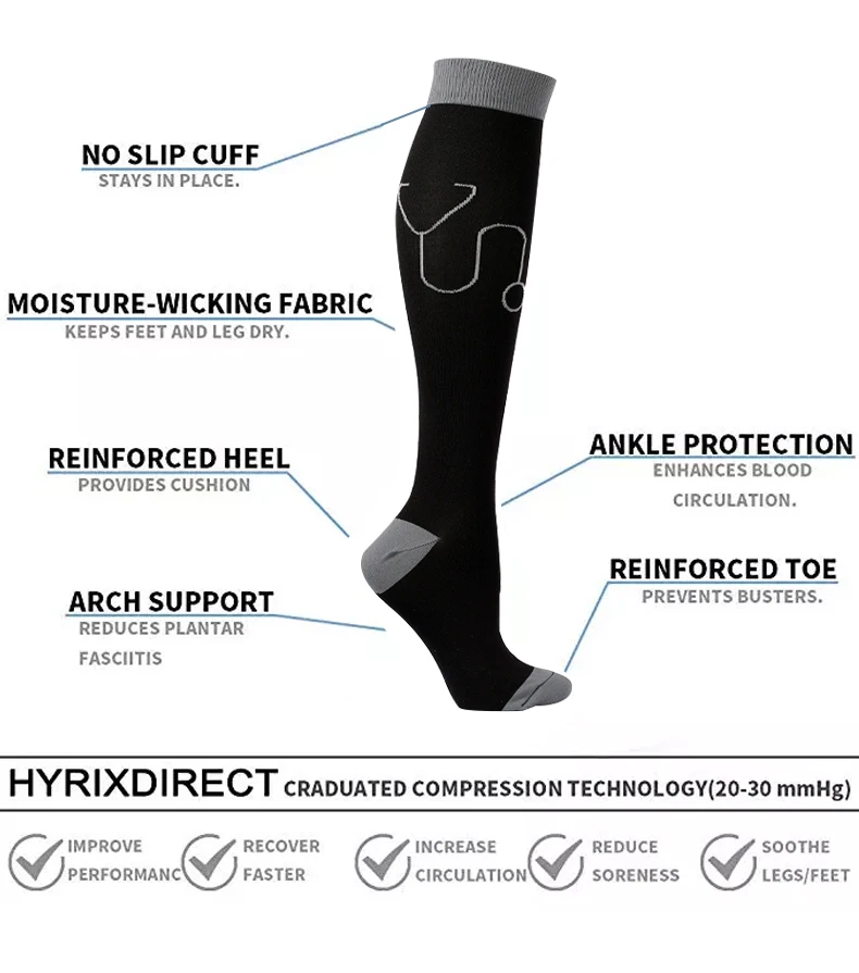 Whether you’re an athlete who wants to excel in the game, who sit for long period during travel or at work, or someone dealing with pain due to a chronic condition, supporting proper blood flow to your feet is of the utmost importance.Our Compression Socks are engineered with the latest arch to calf compression technology, offering a targeted foot to calf muscle support,help to keep blood flowing to boost athletic performance and alleviate pain due to a number of conditions.