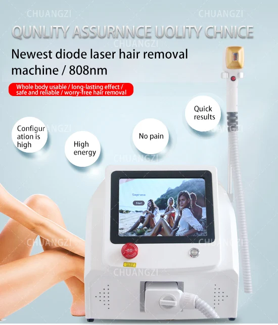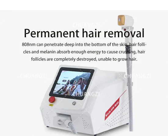 808 Diode laser hair removal machine freeze through technological innovation, so that the treatment of head to negative temperature, unlike other laser burns the skin, to better protect the skin, hair follicle melanin by specific wavelength of laser absorption, and the heat exchange to destroy hair follicle, the laser energy can be shot down into the hair follicles within the hair follicle is destroyed energy decomposition, so that the hair follicles to stop growing, because the laser energy about 15% of the skin can penetrate the dermis layer, the epidermis and more with melanoma of the hair follicle deep through the heat damage to hair follicle degeneration and atrophy; achieve permanent hair removal results.