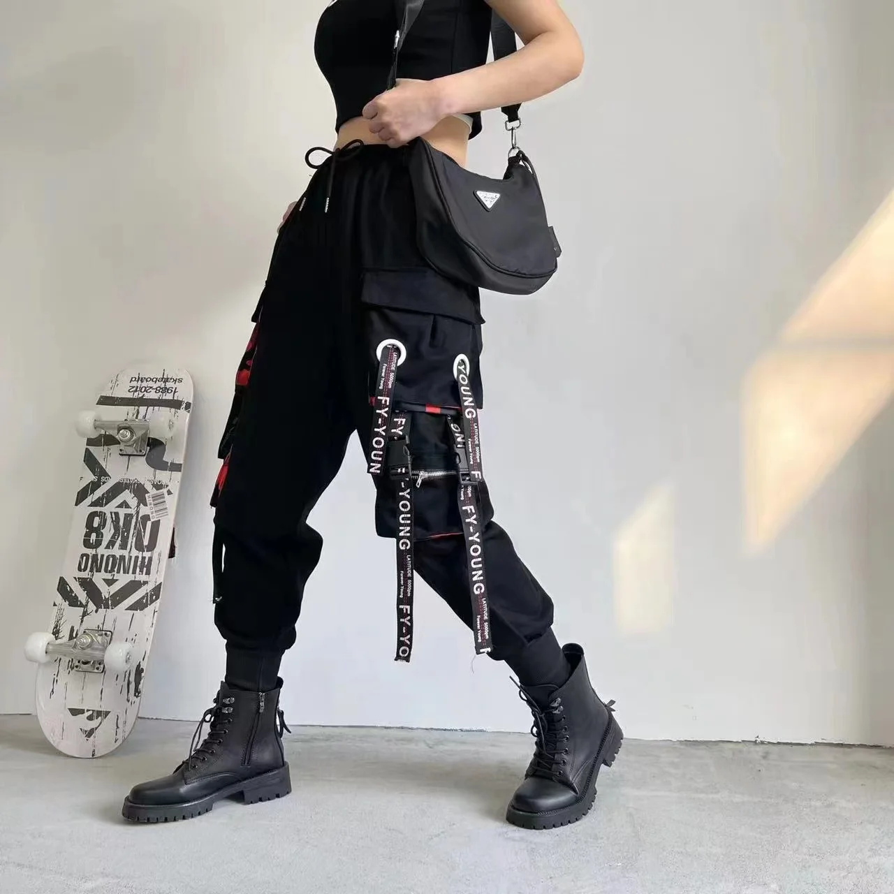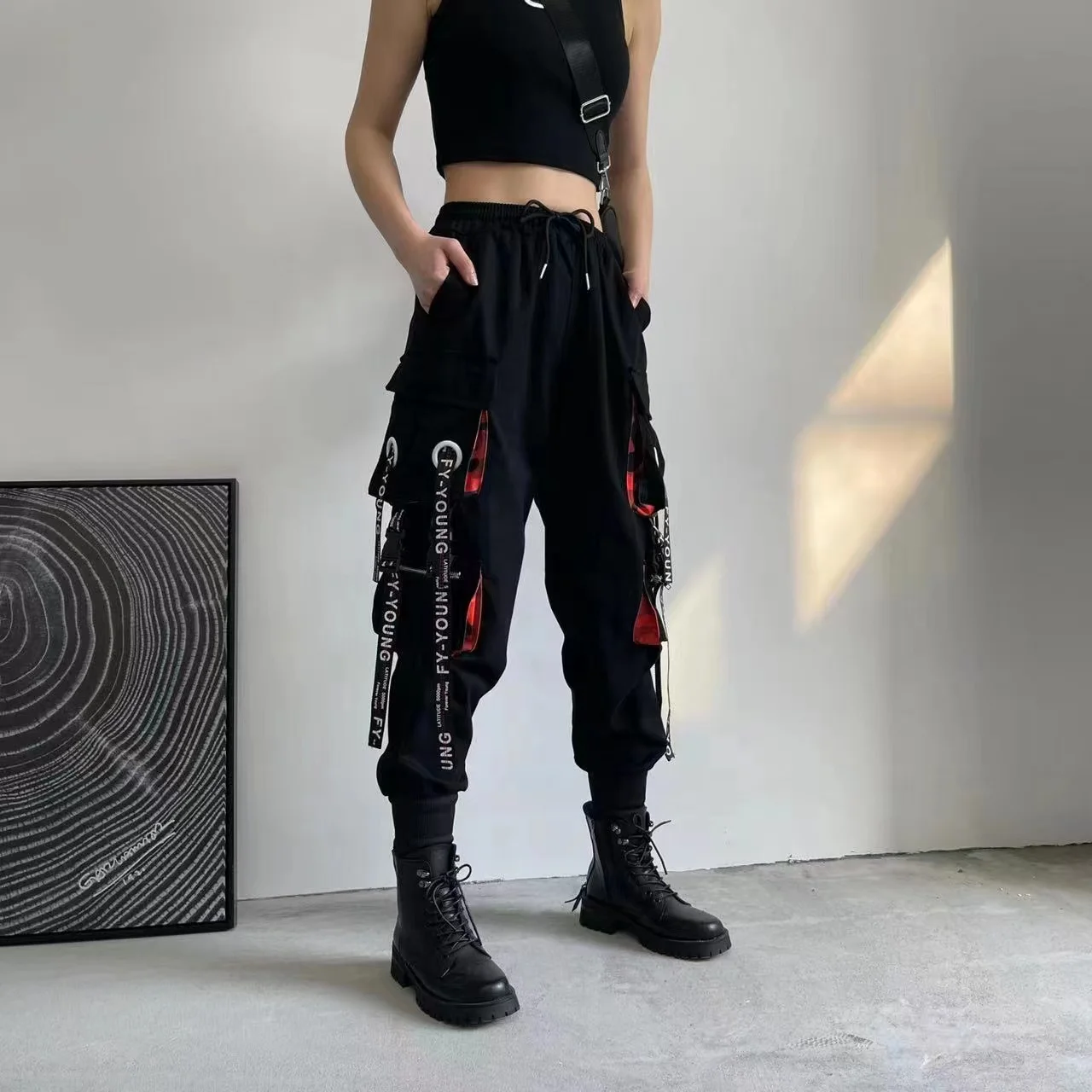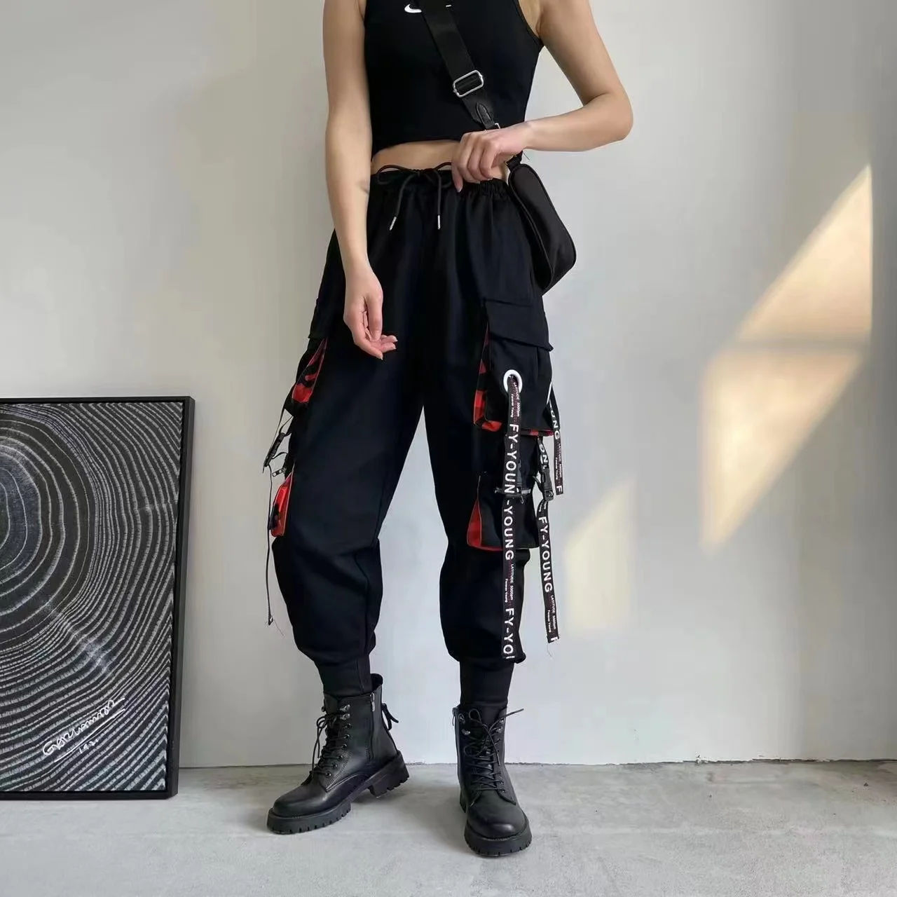 2023 New Side Pocket Cargo Pants Women's Street Wear Ribbon Hip Hop Pants Ins Trend Summer Overalls Girls Black Casual Trousers