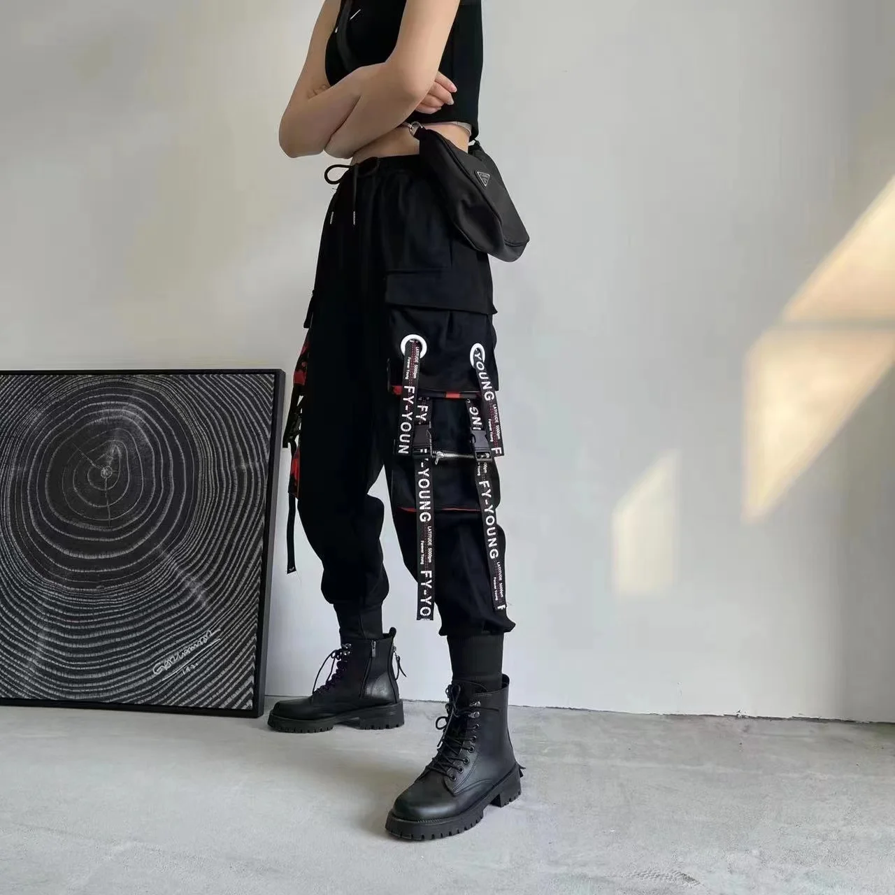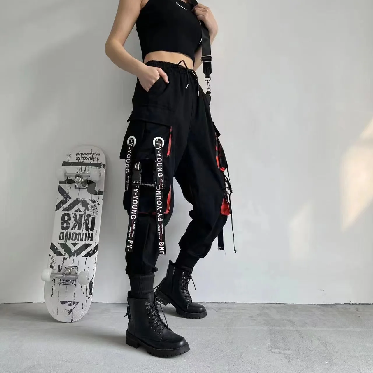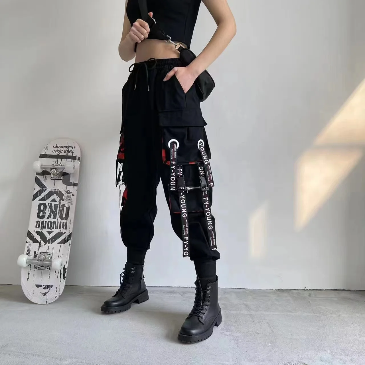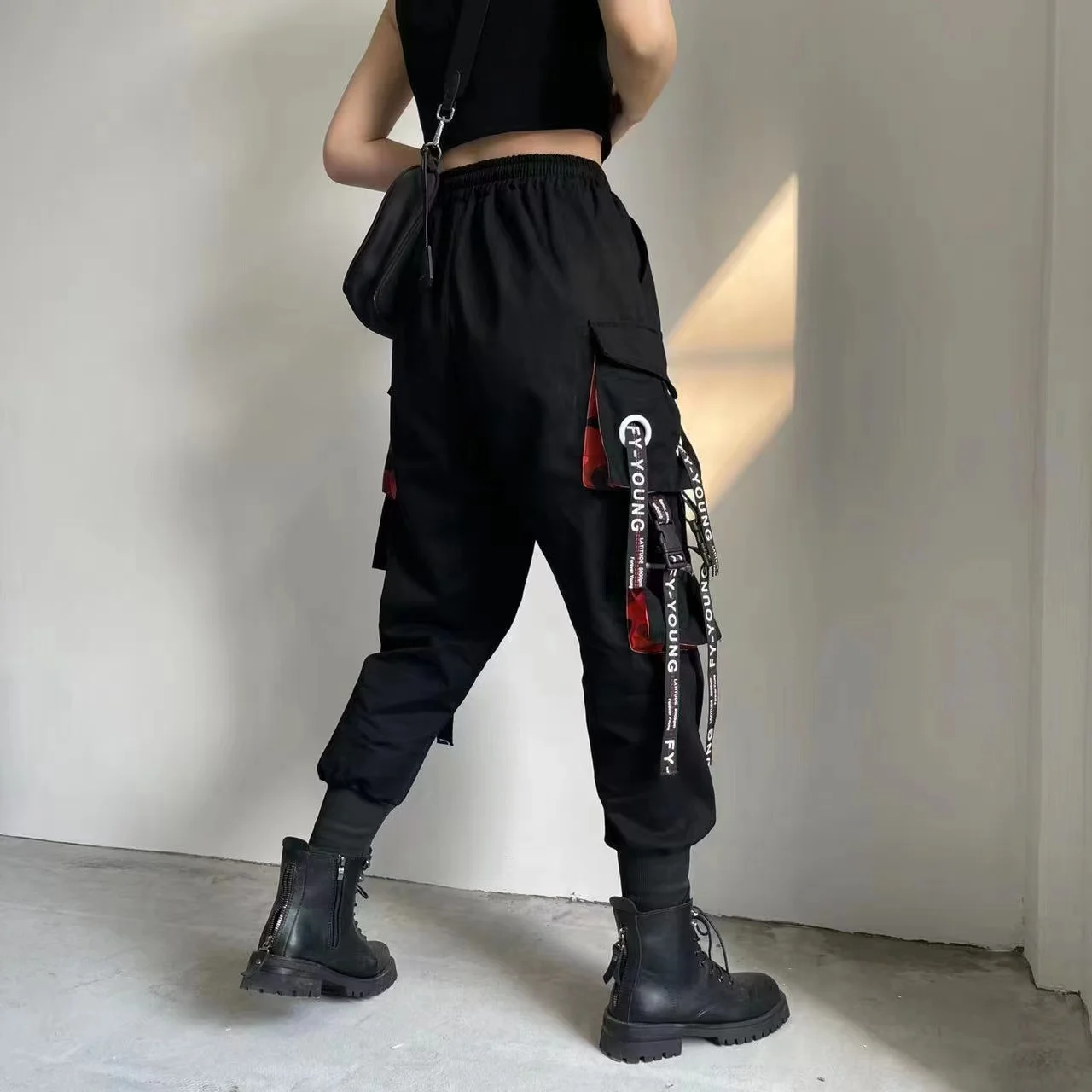 2023 New Side Pocket Cargo Pants Women's Street Wear Ribbon Hip Hop Pants Ins Trend Summer Overalls Girls Black Casual Trousers