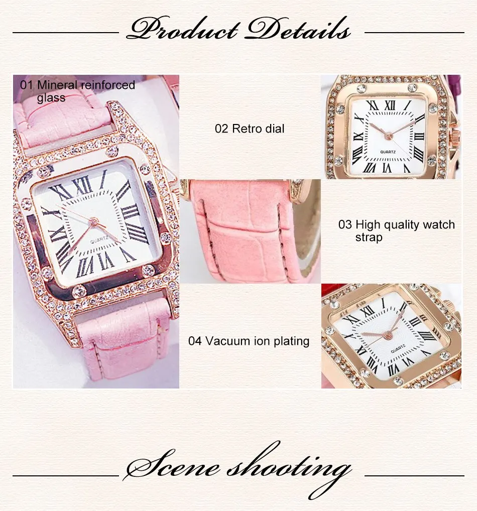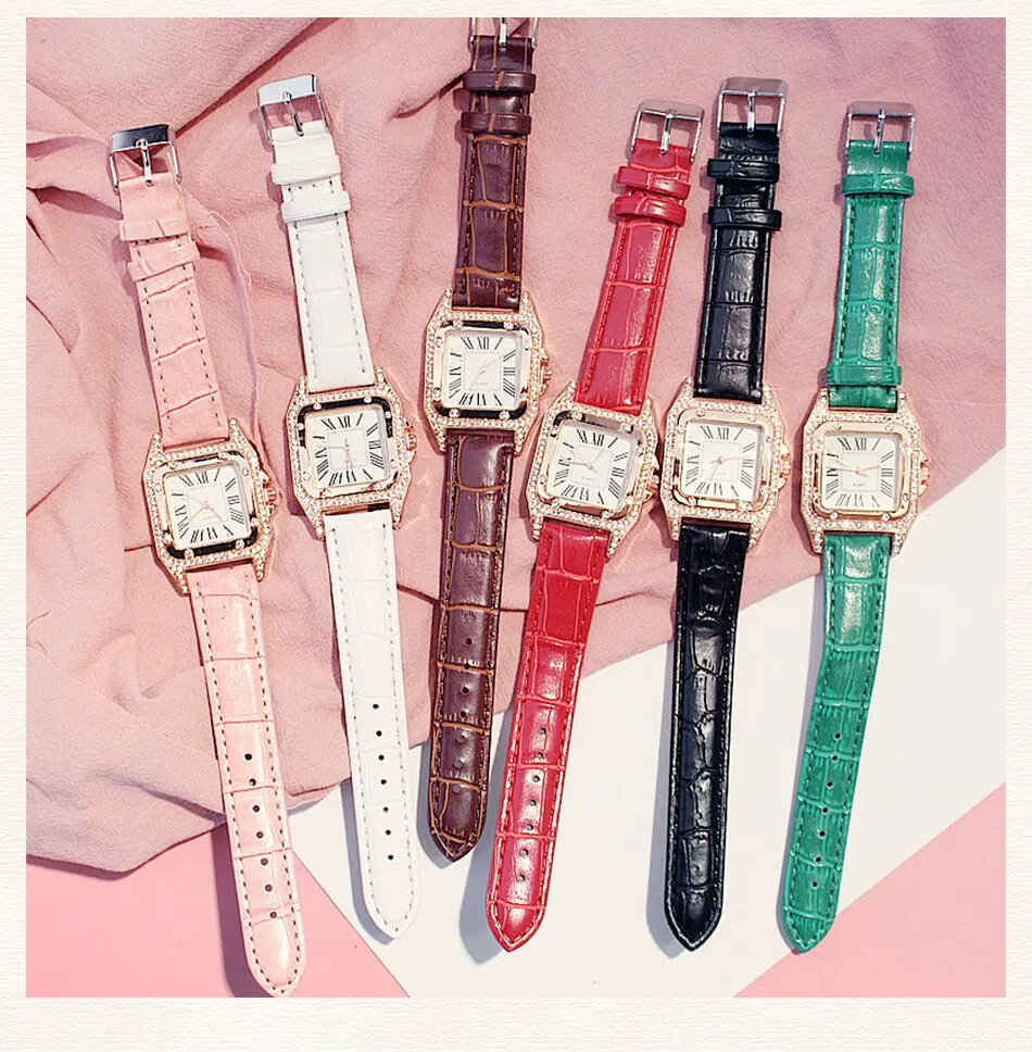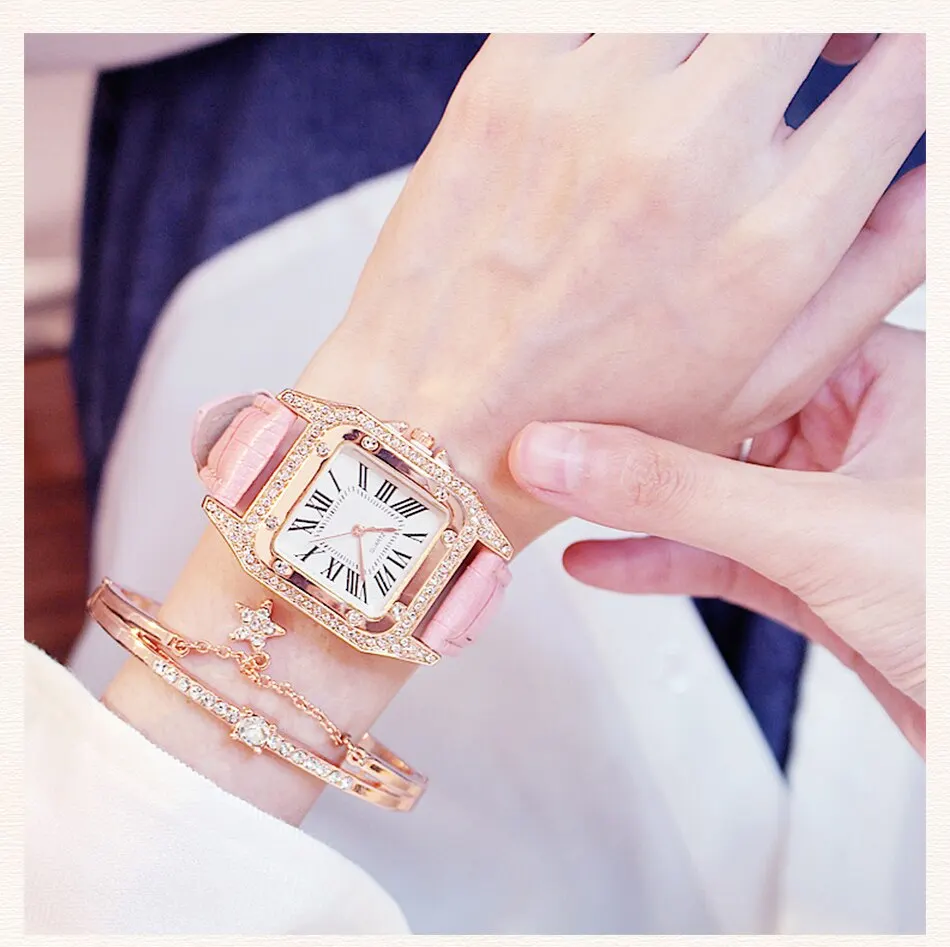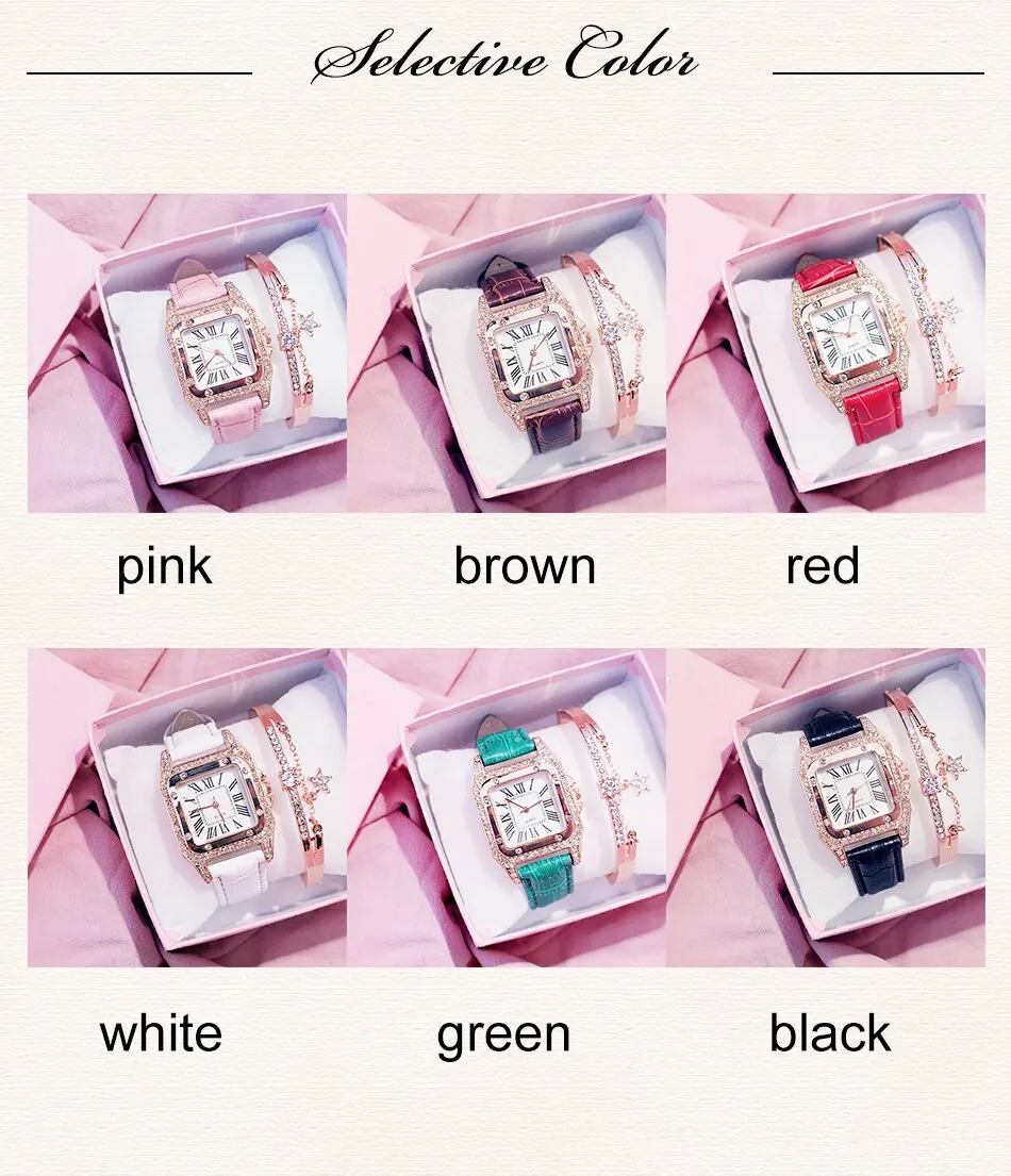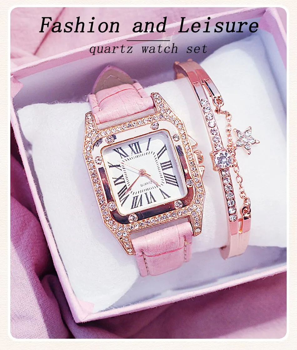 2Pcs Set Women Diamond Watch Starry Square Dial Bracelet Watches Set Ladies Leather Band Quartz Wristwatch Female Clock