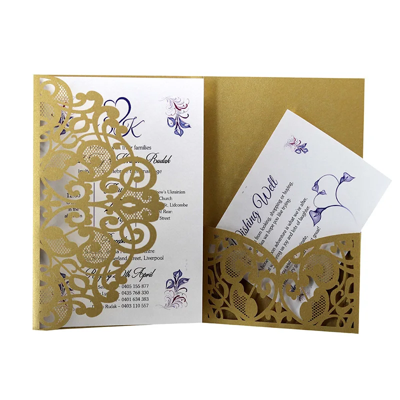 50 covers and inserts=50pcs laser cut pockets + 50pcs small inner blank cards + 50pcs big inner blank cards,no envelope,no sticker