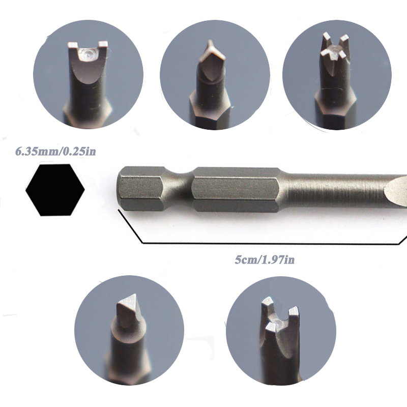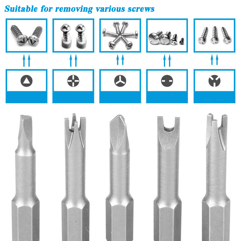 Versatile Usage: This set of five special-shaped screwdriver bits,  6.35mm 1/4 handle, can be used with both manual and electric screwdrivers. The set includes U-shaped, Y-shaped, triangular, and other shapes, making it suitable for disassembling screws in various situations, such as plug sockets, fuse boxes, and electrical appliances.