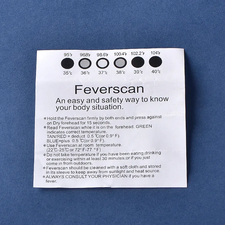 The principle of reusability of the forehead temperature sticker: the sensitive temperature sensitive color changing material is used in the temperature area of the product, and different colors will be displayed in different temperature ranges. After the technology controls the color changing range of the material, it will change color according to the current body temperature after being close to the human body. 36 ℃ and 37 ℃ are in different temperature areas, so that the color will be displayed in the LCD temperature display area of the product. Take the human body away, and the color changing material will cool down after leaving the heat source, The liquid crystal area is restored to its original state, and temperature measurement can be continued after it is close to the human body again