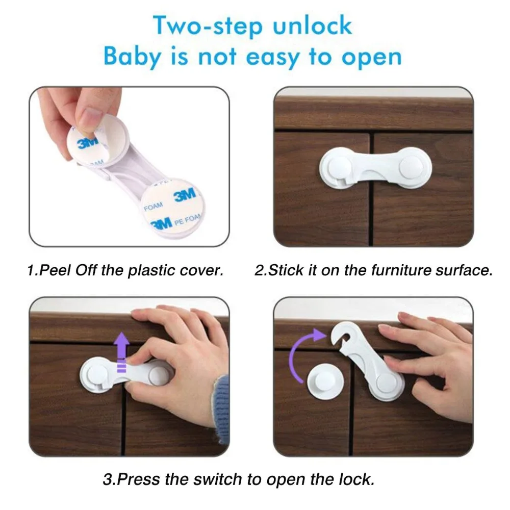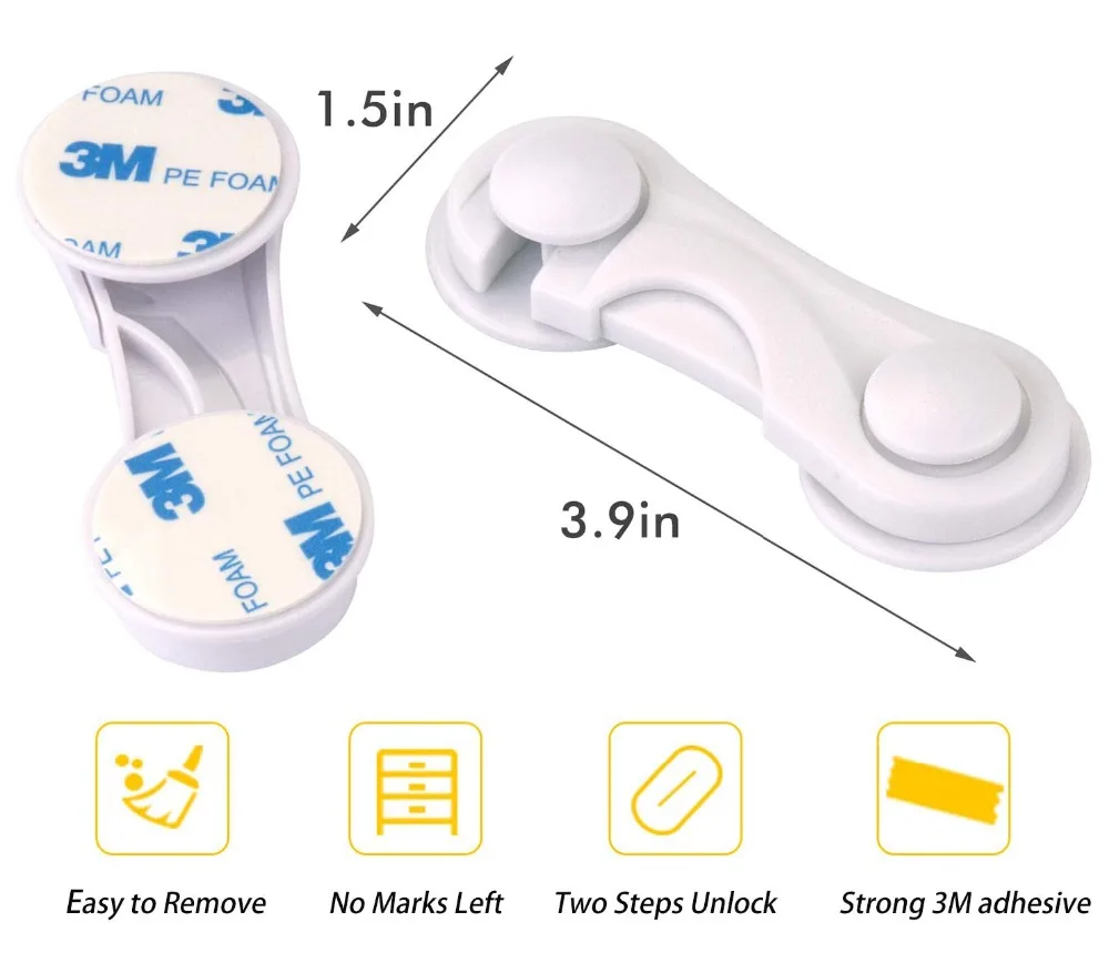 • Safe Material: This safety cabinet locks is made of eco-friendly ABS material and with strong 3M adhesive, to keep our toddlers out of harms way. (You can pull this off by applying some heat (blow dryer) for a minute or two and it comes off easily.)