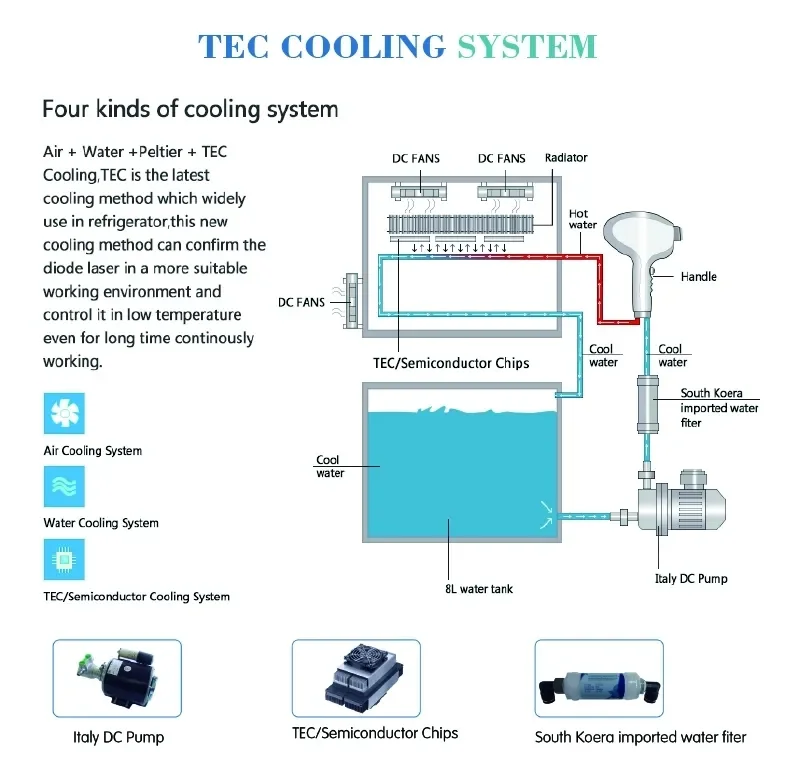 machine, TEC cooling system for Sapphire handpiece 0-5 °C, which makes the treatment always comfortable.