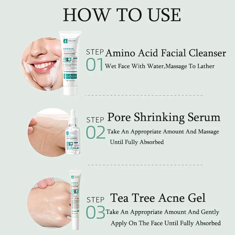This product’s anti-acne gel is rich in Centella asiatica, tea tree, etc., which can help the skin to effectively reduce inflammation and anti-acne, shrink pores essence, and improve large pores; amino acid foam facial cleanser removes excessive facial oil, restores skin luster, and improves dark Sink, prevent acne from appearing.