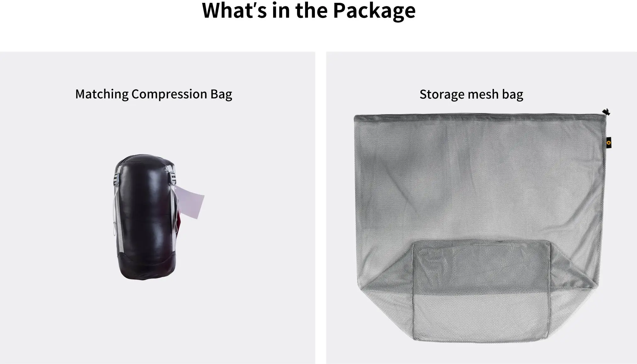 Comes with an ultra-light compression bag and a mesh storage bag.