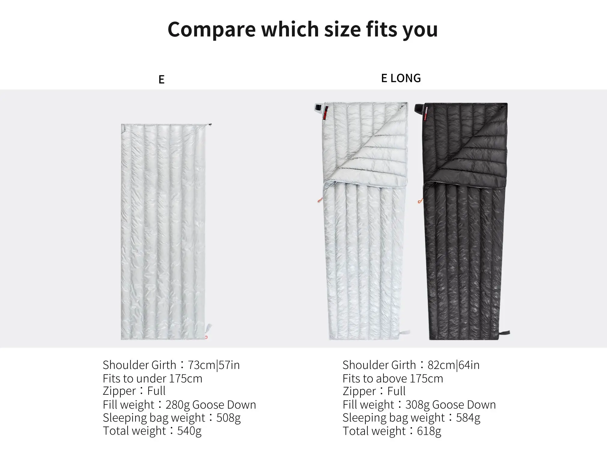 E-Lengthen: Fill weight:308g |Sleeping bag weight:584g | Chest girth 163cm | Hip girth 152cm | Footbox girth 120cm | Size:200x80cm | Package:12x20cm.