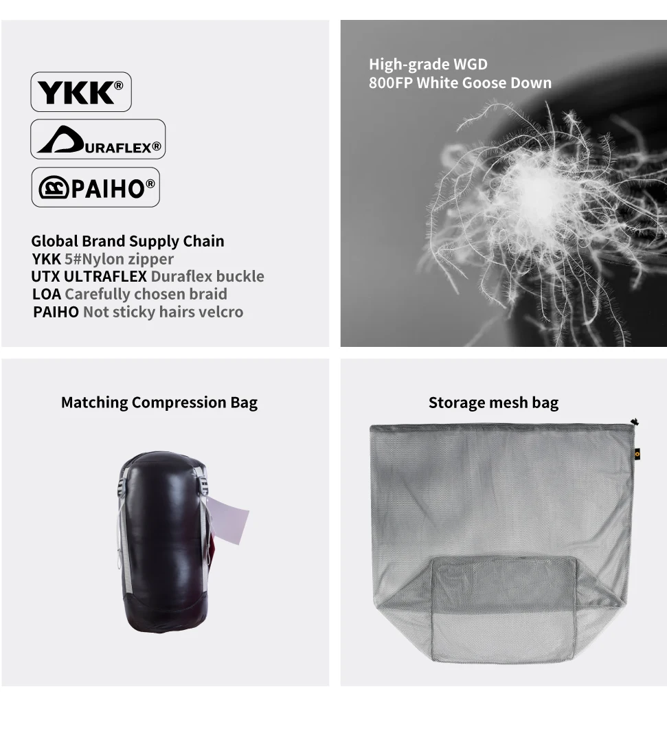 • Specs of E-mini-M: Weight 508g| Fits 180cm | Chest girth 145cm | Hip girth 145cm | Footbox girth 145cm | Insulation 800 Fill Power Goose Down| Storage bag and stuff sack included