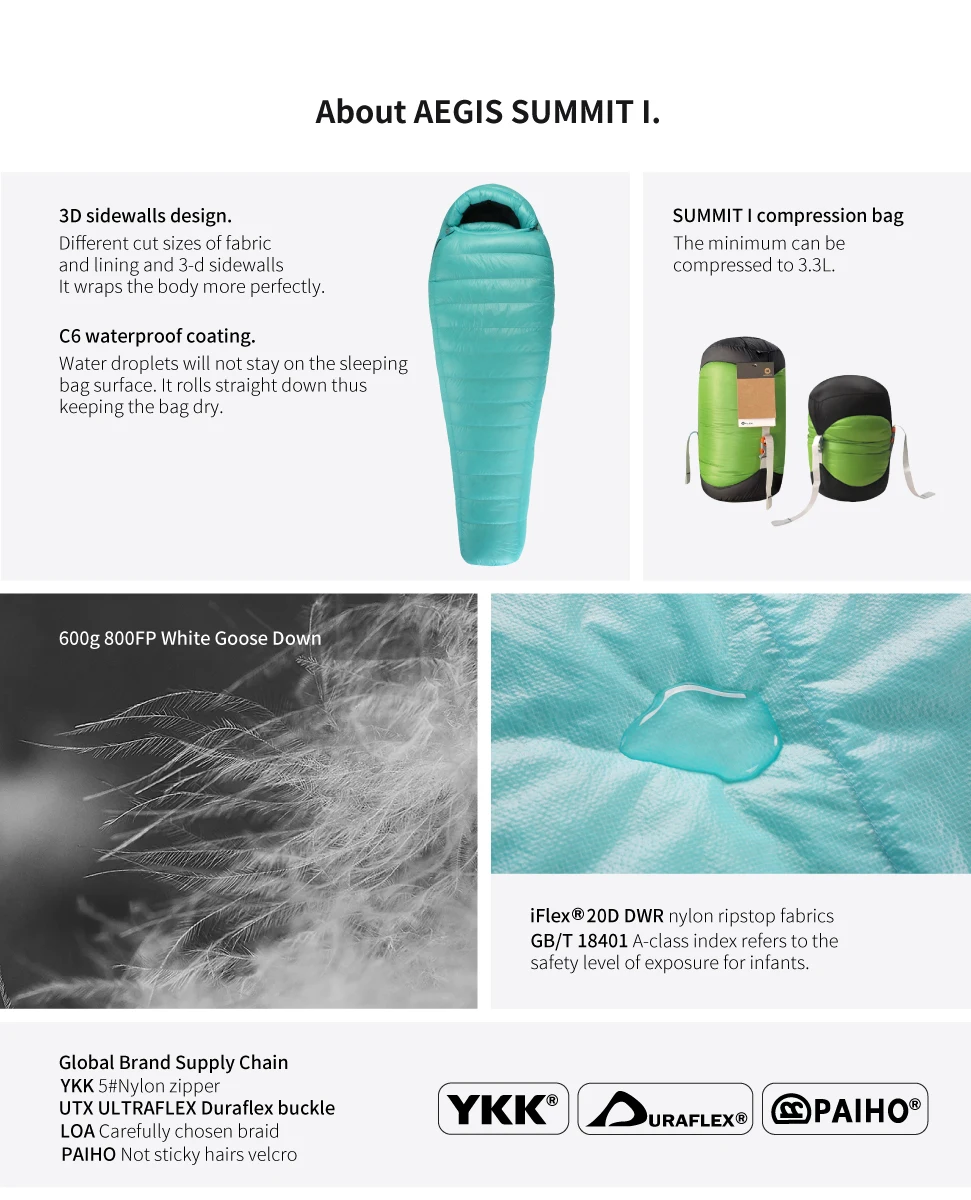 AEGISMAX SUMMIT is a mummy-style package that fits the curve of the human body. IFlex 20D nylon ripstop fabrics shell and touch soft liner offer durability and comfort. Friendly C6 treatment technology finish that resists stains and moisture, gives the right balance of warmth, packability and weight. with incredible comfort.