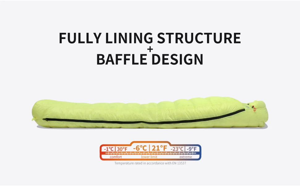 SUMMIT II-Lengthen: Fill weight 900g | Sleeping bag weight:1300g | Total weight:1356g| Fits 196cm|Size:216x82cm | Package:18x30cm| Compression sack size: M 56g | Compression sack volume:14L-4.5L.